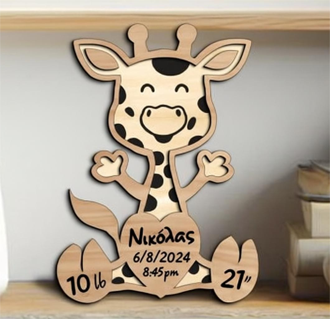 Αναμνηστική καμηλοπάρδαλη με τα στοιχειά του μωρού σας. Υλικό κατασκευής ξύλο.