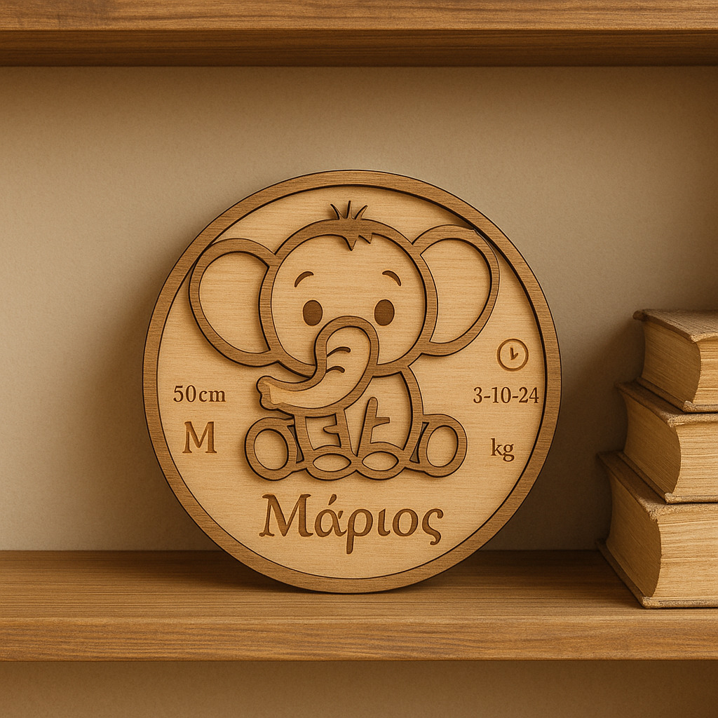 Αναμνηστικό ελεφαντάκι με τα στοιχειά του μωρού σας. Υλικό κατασκευής ξύλο-plexi glass